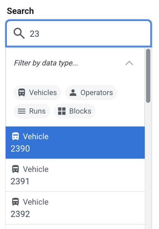 Search: Start typing and get results for any item that we have integrated, such as vehicle ID, block ID, run ID, or operator ID. More relevant results are placed at the top.