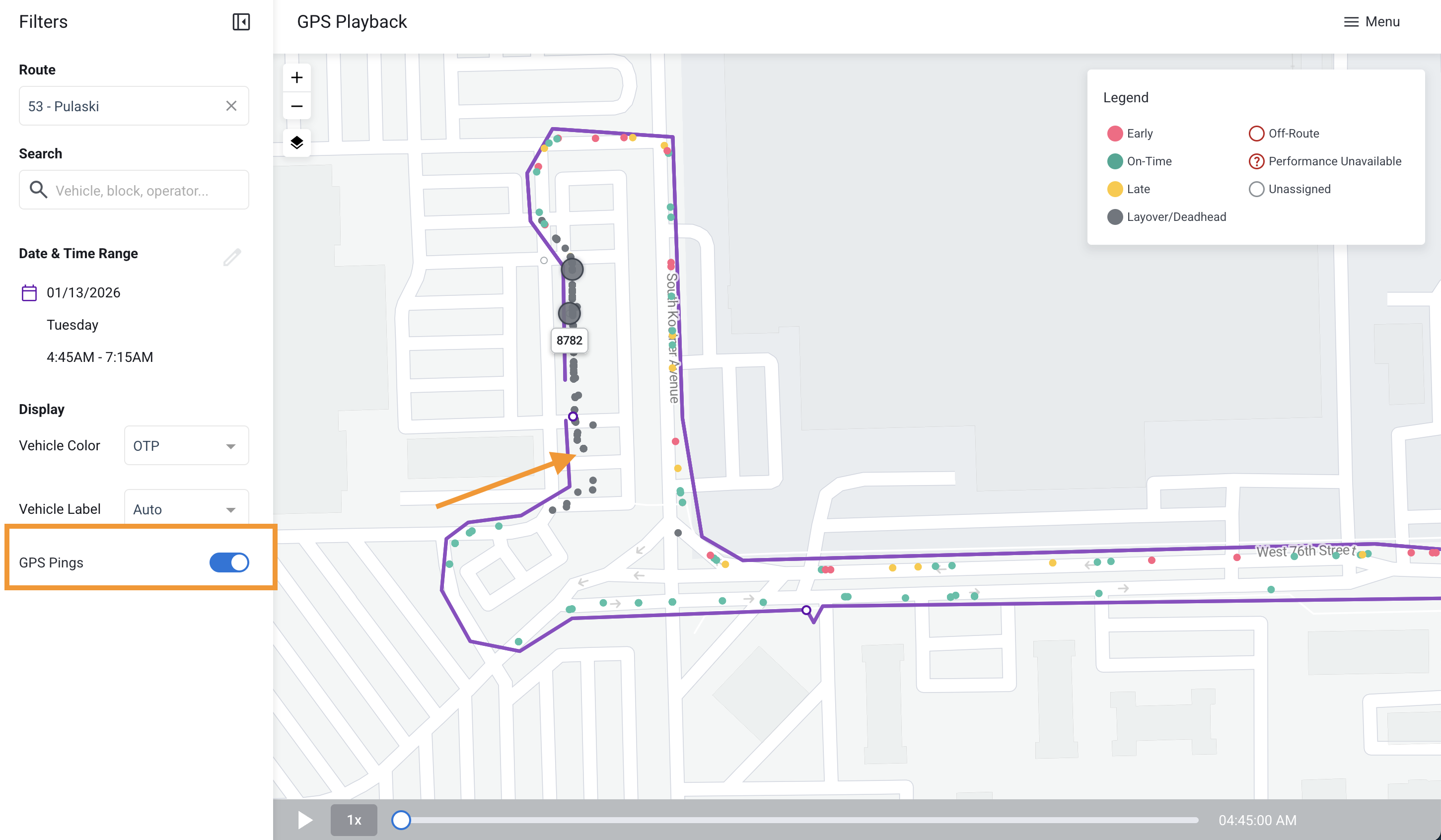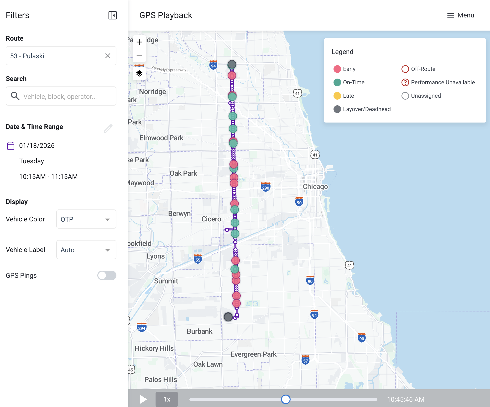 Overview: Select a route, vehicle, run, operator or block from the search box, select a date, and specify a time range. Once the replay is generated, you can toggle the playhead at the bottom using your mouse or the play button.