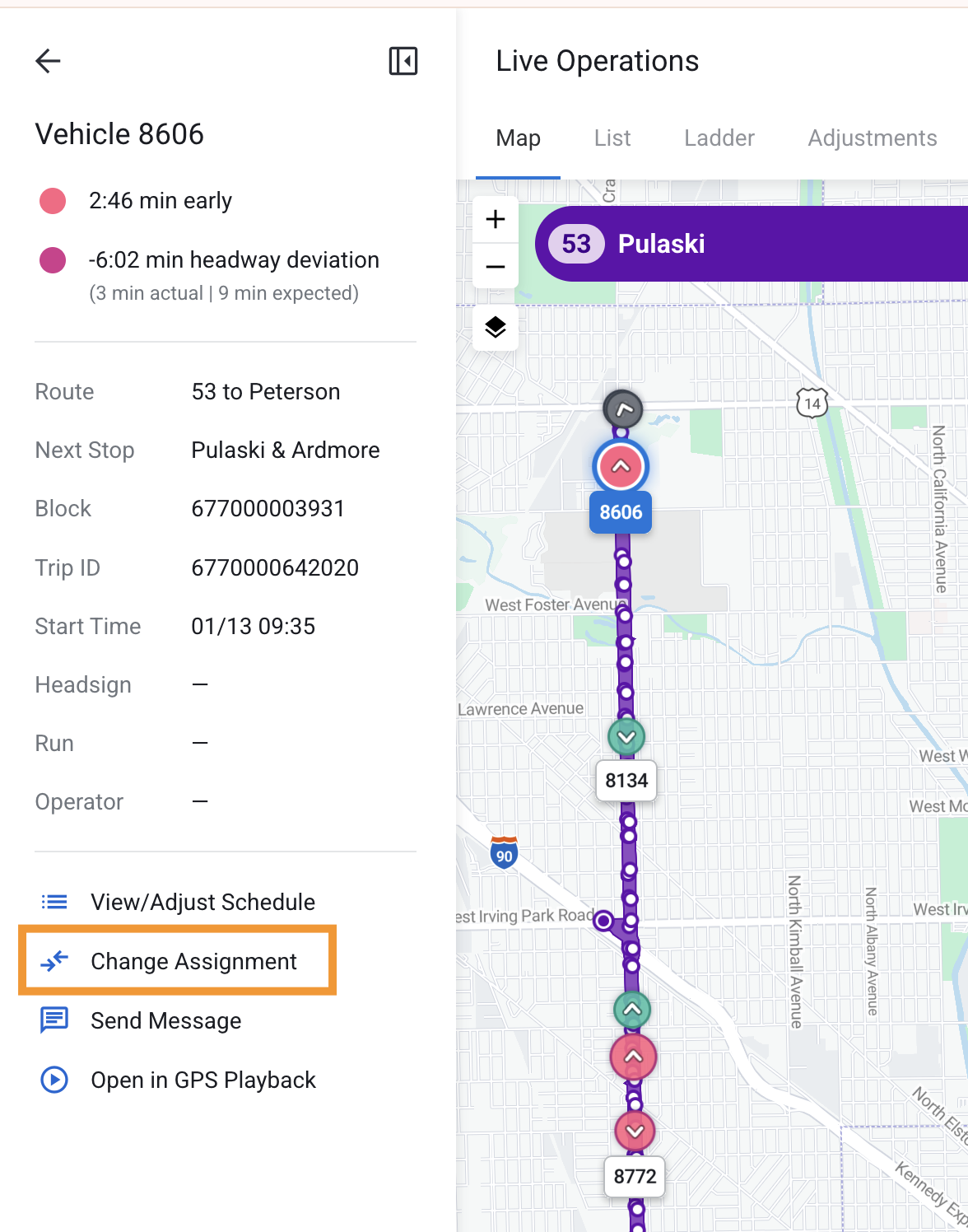 - Note: this feature will only work for users with "Assign Vehicles" permissions. If you need access to this feature, please reach out to your agency's Swiftly point of contact]