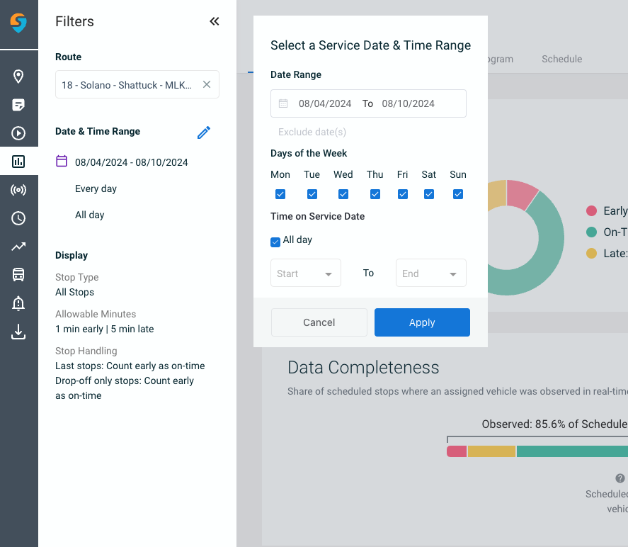 Filters: In the On-Time Performance product, you can look at data for your whole system, or hone in on a specific route's performance. You can also look at performance for a single day or over a longer date range. You can exclude dates that may impact on-time performance (snow days, events that disrupt service, etc.). Lastly, you can adjust on-time performance parameters--these changes will persist in other products during the current dashboard session, but any setting changes will reset when you log in again.