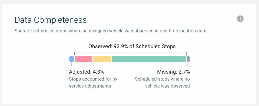 The Data Completeness chart in On-Time Performance helps put performance data in context. While the On-Time Performance summary chart shows the percentage of observed stops that were on time, late, or early, the Data Completeness chart shows how that fits into the full picture of your scheduled service to better understand the rider experience.