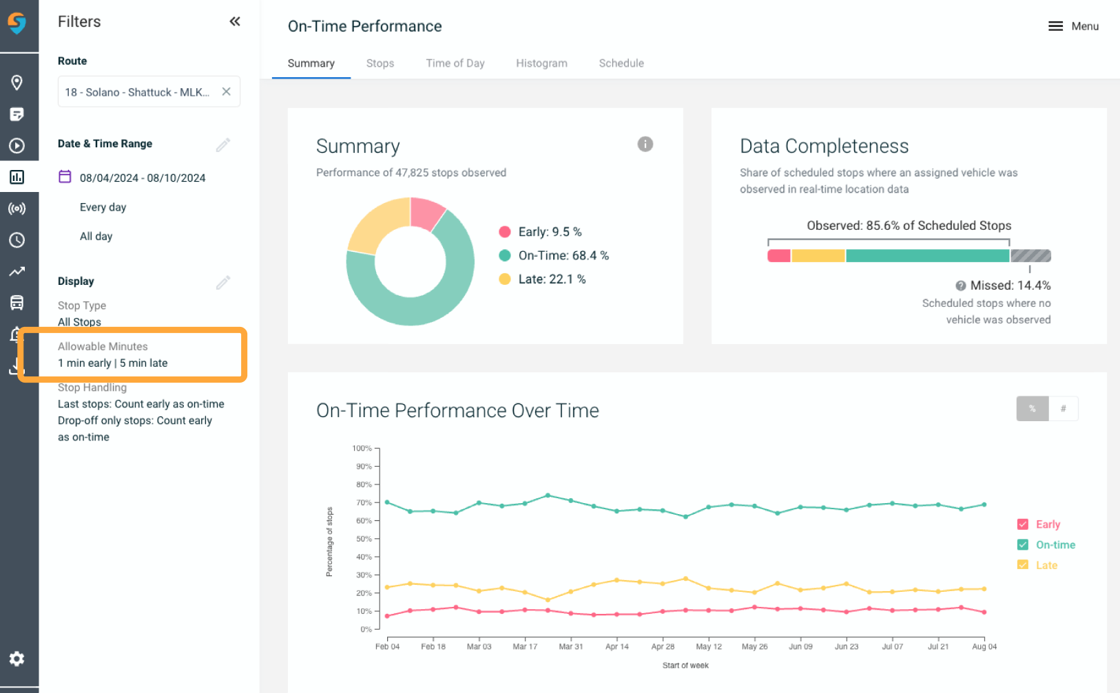 The default settings for On-Time Performance parameters in the Swiftly dashboard are 1 min “early” and 4 min “late.” These default OTP parameters can be reconfigured to any standard definition of “early” and “late” that is used operationally for your agency.