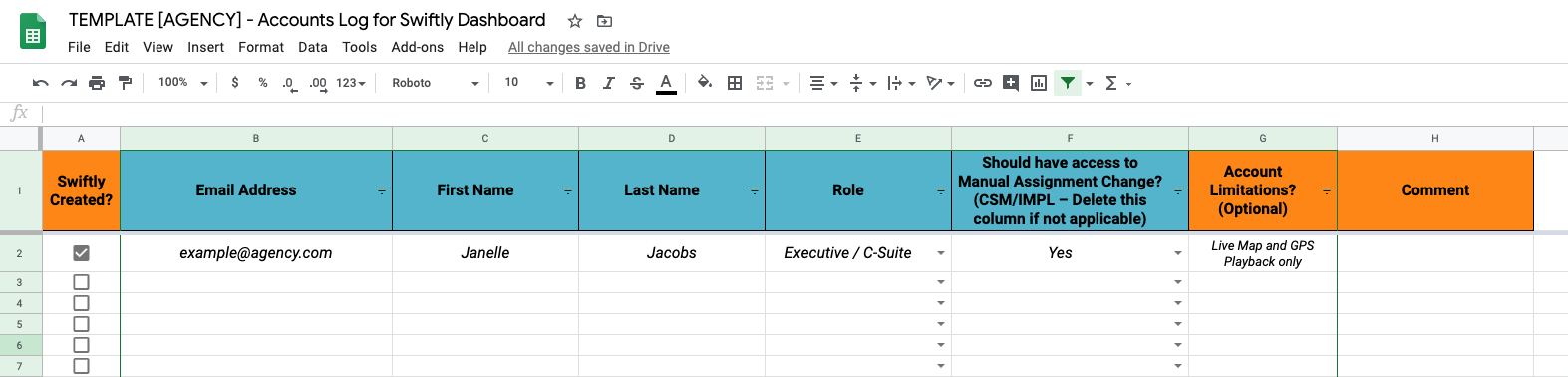 Your agency account sheet is shared between Swiftly and your agency and is maintained and updated by Swiftly's main point of contact at your agency. If you or a member of your team needs to be added to the account sheet, please use your agency's internal support methods to request a new account. They will then add you or your teammate to the sheet, which will automatically alert the Swiftly Team to set up the new user account.
