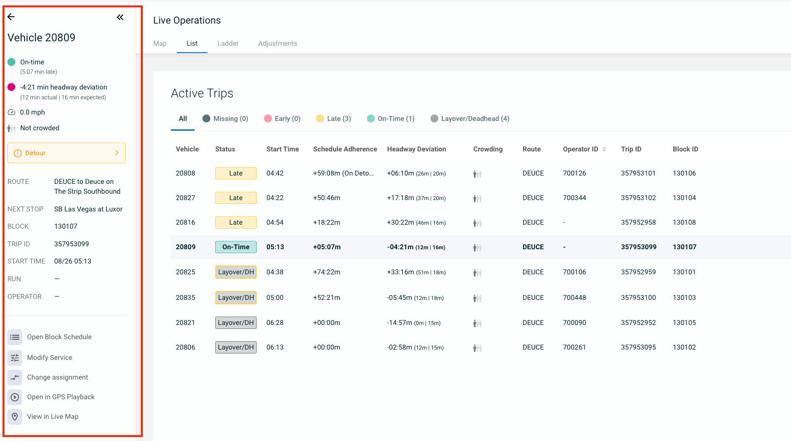 Vehicle Details: Click on any vehicle or search for it to get details like the Vehicle ID, trip information, on-time performance, next stop, operator ID (if integrated), block (live or upcoming), and more! Vehicle details will show up on the left-hand side. When you select a vehicle, the details panel will retain information about that vehicle, even when you switch between the other Live Operation views (Live Map and Live Ladder).